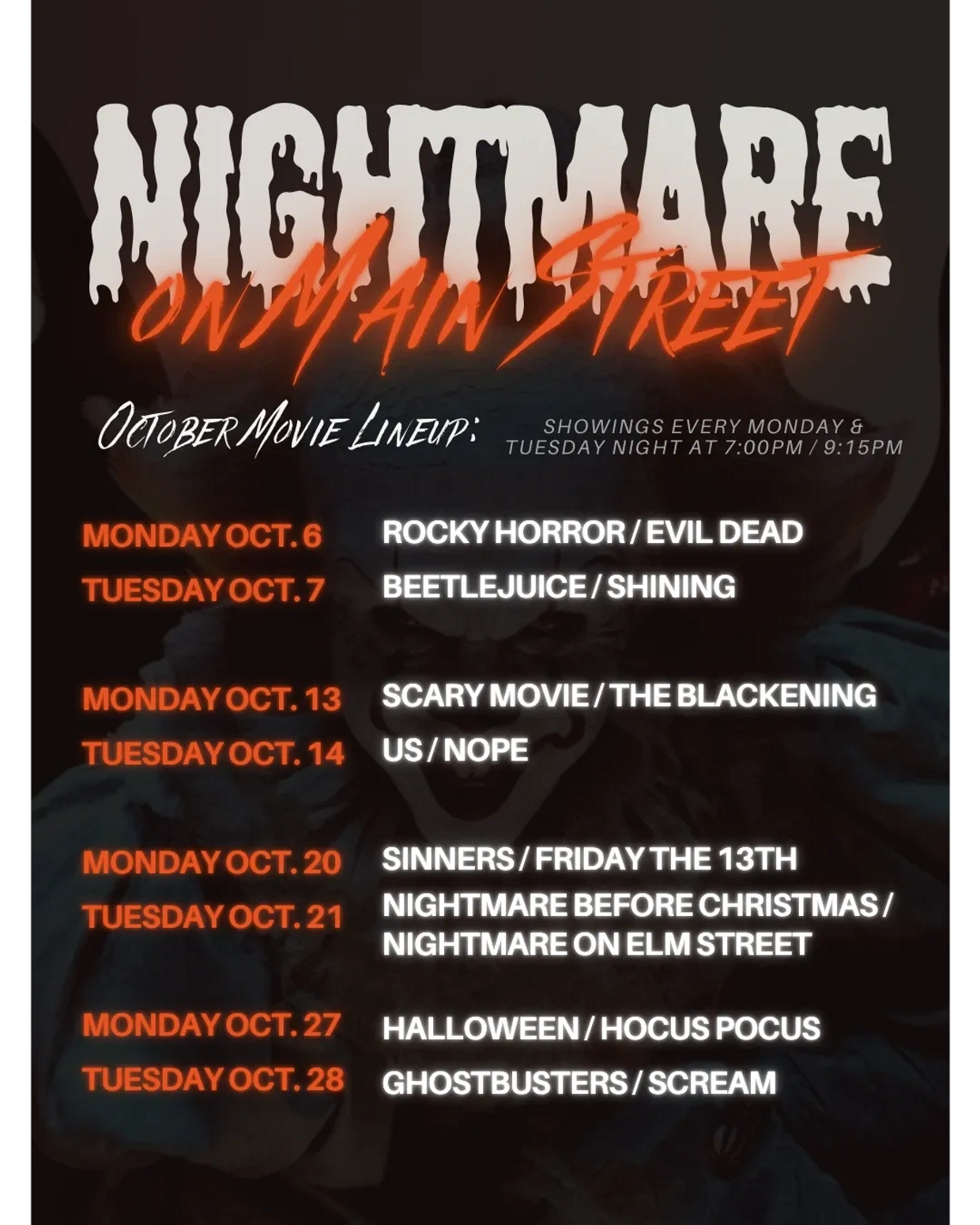Join us each Monday & Tuesday as we play some of our movie favorites at Primrose. Tequila and elevated LIT specials are sure to set the mood accordingly. First movie showing at 7pm, second showing ~9:15pm.